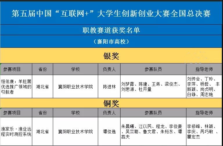 近日,教育部公布第五届中国“互联网+”大学生创新创业大赛获奖名单,襄阳职业技术学院参赛项目收获一银一铜。其中,《恒佑康:羊肚菌优选推广领域的引航者》获银奖;《渔家乐·渔业远程实时测控系统》获铜奖。