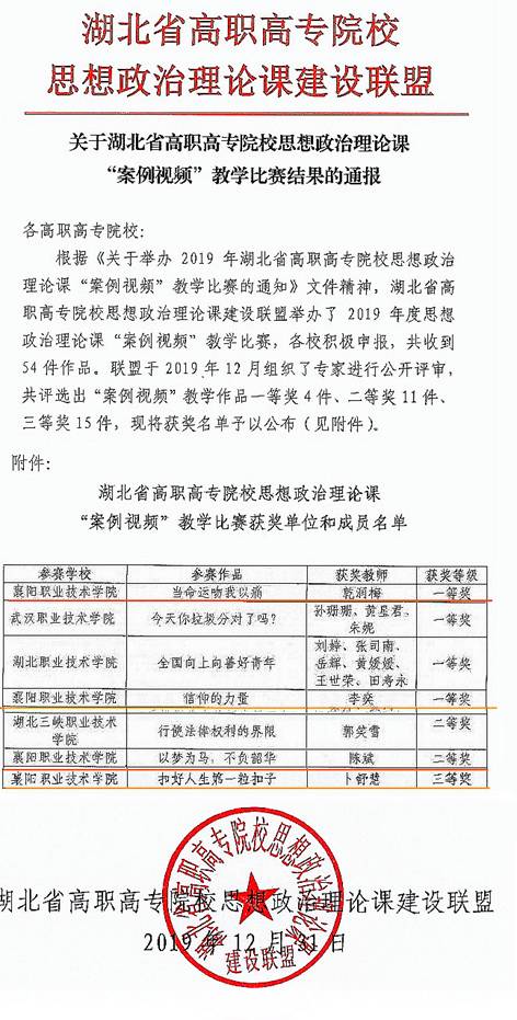 1月3日,2019年湖北省高职高专院校思想政治理论课“案例视频”教学比赛圆满落幕。襄阳职业技术学院马克思主义学院4名教师报送的参赛作品全部获奖。其中,乾润梅老师的作品《当命运吻我以痛》荣获一等奖第一名,李奕的作品《信仰的力量》荣获一等奖第四名;陈斌的作品《以梦为马,不负韶华》荣获二等奖;卜舒慧的作品《扣好人生第一粒扣子》荣获三等奖。此次比赛,该校教师获奖的数量和等级均居全省同类院校第一名。