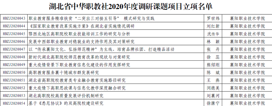 近日从中华职业教育社传来喜讯:襄阳职业技术学院林颖、沈传华等申报的14项2020年度中华职业教育社调研课题获准立项。其中,林颖主持的《发展中西部职业教育对稳就业的支持作用及其对策研究》、罗世炜主持的《中西部地区教育扶贫路径与模式研究》2项课题获批中华职业教育社重点项目;沈传华等12位教师的项目获湖北省中华职业教育社立项。这也是该校获得中华职教社立项级别最高、数量最多的一次。