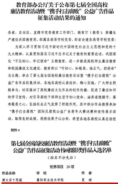 日前,襄阳职业技术学院师范学院(特殊教育学院)小学教育1802班学生夏婧的作品入选第七届全国高校廉洁教育活动暨“携手打击腐败”公益广告书画摄影类作品优秀项目。