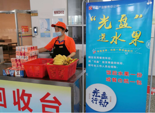 推行节约奖励,鼓励“光盘行动”。在校区食堂餐具回收处,后勤设立了“光盘换水果”赠送点,每位前来就餐的师生都可凭借吃光的餐盘领取一份水果或一包纸巾。此活动开展以来,取得了较好的效果。