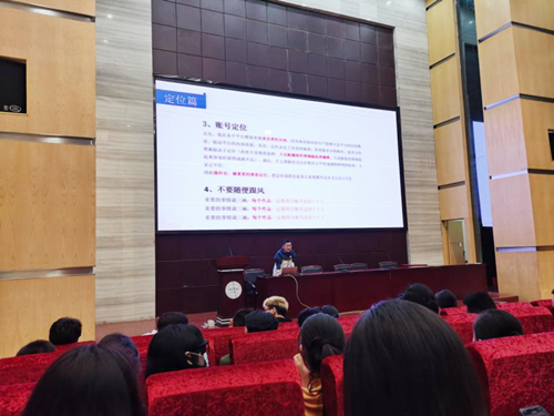 朱婷婷先后在医学院、旅游与艺术学院、经济管理学院作了三场报告,介绍了她在毕业后,仅用两年时间便成功创业的先进事迹,重点介绍了自己如何运用抖音等新媒体营销手段,实现零成本引流顾客,为创业助力。在为学弟学妹们带来满满干货的同时,朱婷婷邀请他们运用新媒体手段共同创新创业,引得上百名在校生积极响应。
