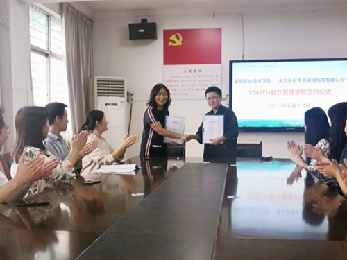 返校期间,朱婷婷与学校签订了校企合作共建餐饮管理学院的协议。