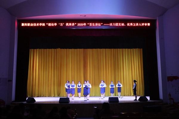 10月19日晚,由襄职团委主办的“理论学‘习’我来讲”2020年“百生讲坛”——优秀主讲人、活力团支部校级展演活动在学校大礼堂成功举办。8个院部推荐的10名优秀主讲人和9个活力团支部经过现场展演,最终评选出梁滢丹、廖梦湫、程冲、宋玉鹏4名校级“优秀主讲人”;口腔医学1910团支部、医学检验技术1905团支部、旅游管理1901团支部、建筑工程技术1901团支部、小学教育1906团支部当选校级“活力团支部”。