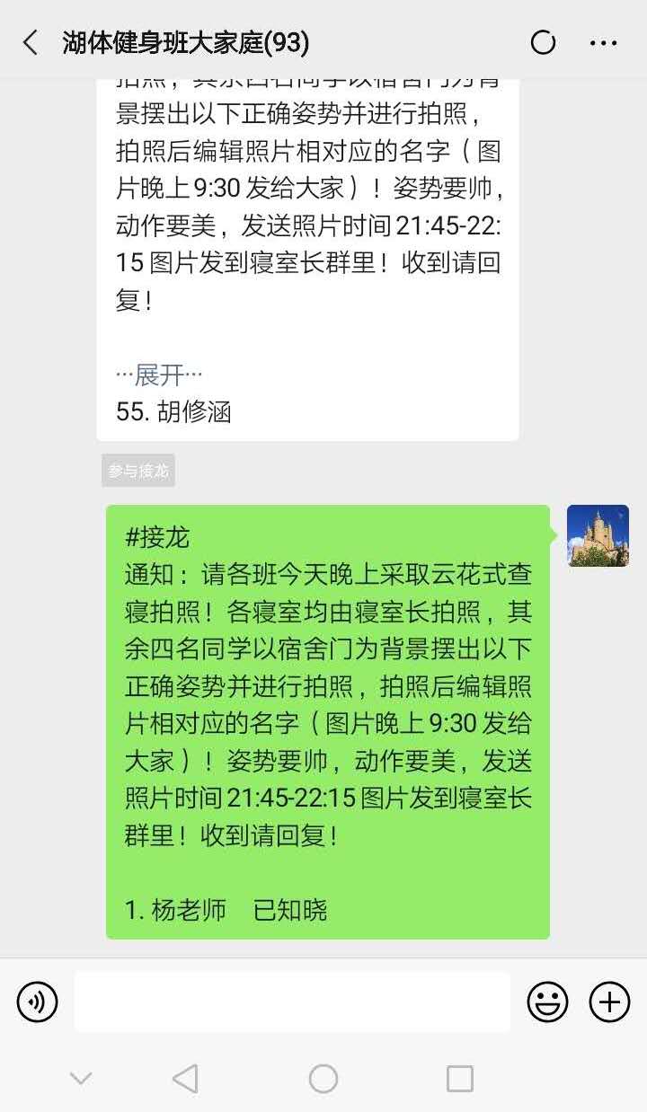 健身指导与管理班班助李列华同学说:“这样的查寝方式特别好,不仅可以更直接地了解同学是否有晚归的现象,拍照的过程也可以增进宿舍成员之间的交流和感情,通过照片还能展示宿舍的风采。”