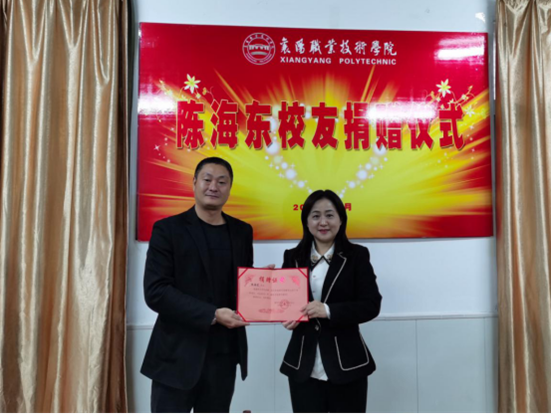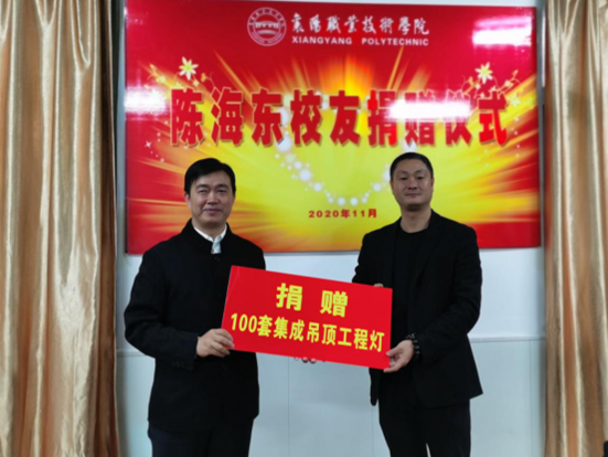 11月3日,正值襄阳职院校友会成立一周年之际,96级经济管理专业校友、萍乡鸿运照明工程有限公司总经理陈海东捐赠物品仪式在校友会会议室举行。该校副校长章伟,就业创业指导中心主任、校友会秘书长林颖,后勤产业服务总公司总经理董珍文等参加了捐赠仪式。