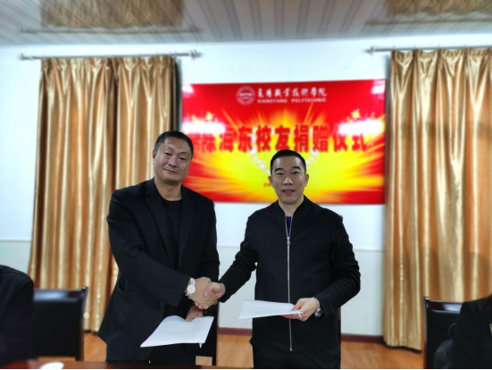 仪式上,陈海东向校友会捐赠100套集成吊顶工程灯,价值人民币18000元,用于学校建设。章伟与陈海东作为双方代表签订了捐赠协议。