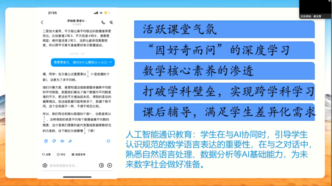 襄阳市东风中学秦玉雪老师以“豆包智能体在初中数学跨学科学习中的应用”为例,构建“数学+信息技术”融合课堂,引导学生解决真实问题,深化知识理解。