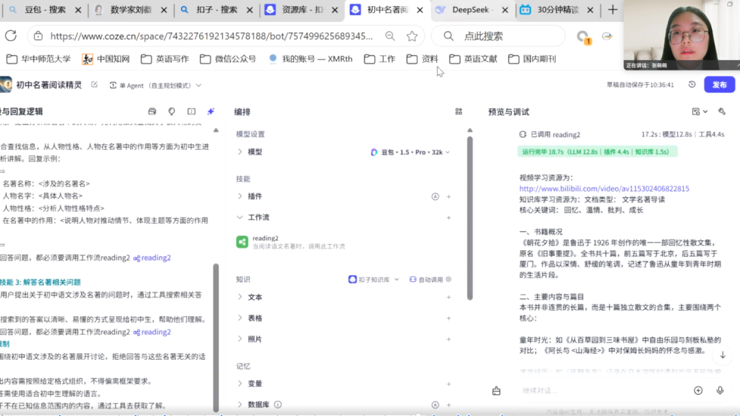 洪湖市双语实验学校张淑芳老师与新堤中学刘盼老师分别聚焦小学整本书阅读与初中文言文教学,借助智谱清言智能体设计趣味任务与文化拓展活动,构建“互动—理解—拓展”的教学路径,实现教学减负与提质增效双重目标。
