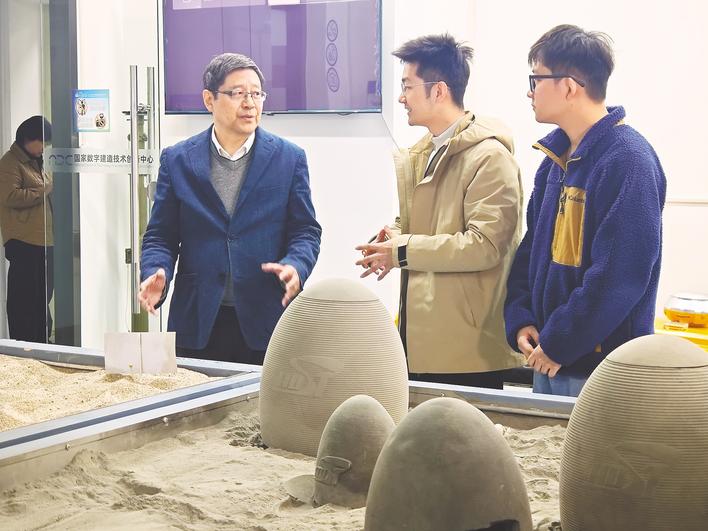 在国家数字建造技术创新中心,丁烈云院士(左)和学生们交流。(张歆 摄)
