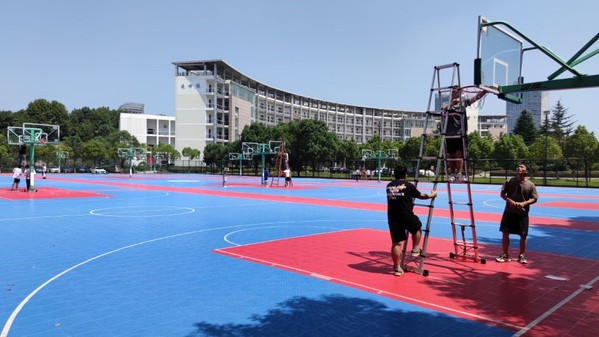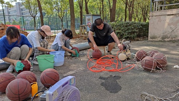 工作人员当天顶着炎炎烈日,上午九时至下午三时,共维护篮球场球架二十余个、足球球门架十个,整理教学教室十间,羽毛球架十几对,为一百余个教学用球进行清洁及补气工作。