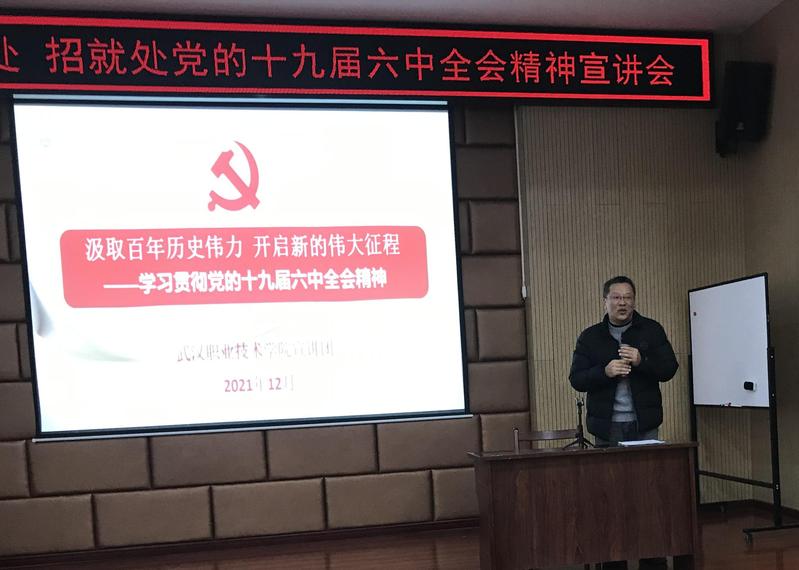 (通讯员 熊晴怡 成盼盼)12月23日上午,在逸云楼124教室,体育美育工作部联合科研与技术服务处、招生与就业指导处共同组织学习贯彻党的十九届六中全会精神,本次宣讲会特邀马克思主义学院党总支书记、院长王秋梅作为主讲人,体美部书记、主任汪胜为主持人,三个单位共43位教职工参加了宣讲会。