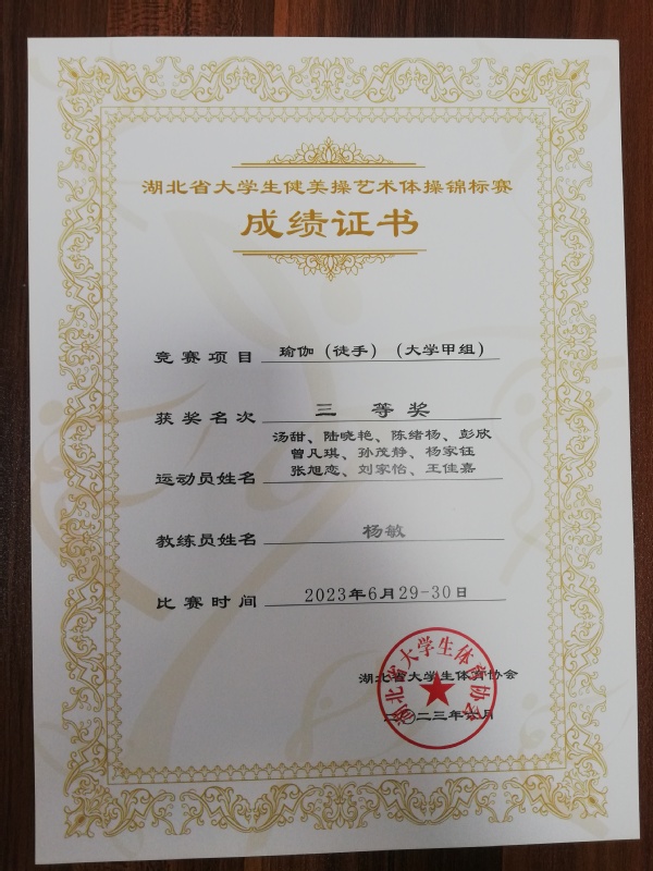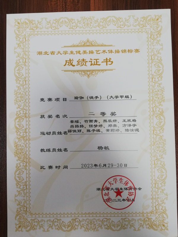 武职网讯(通讯员 杨敏 大学生记者 陈绪杨 汤甜)由湖北省大学生体育协会主办,湖北省大学生体育协会健美操艺术体操分会执行的“2023年湖北省大学生健美操艺术体操锦标赛暨全国大学生(青年)运动会(大学组)健美操(啦啦操)选拔赛”,于6月29日—30日在华中师范大学圆满落幕。7月3日公布比赛结果,我校瑜伽队获得健身操舞项目中集体瑜伽(徒手)二等奖、三等奖各一项。