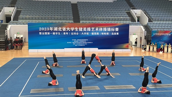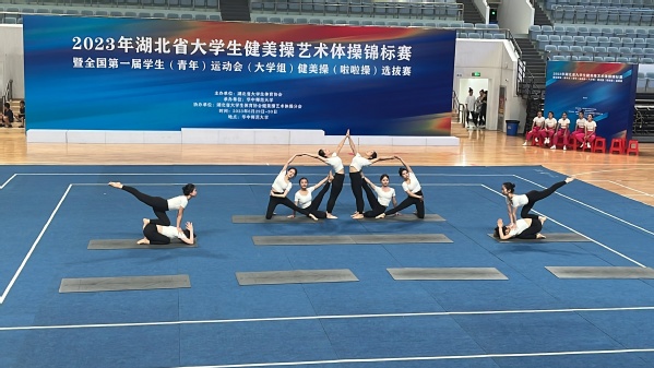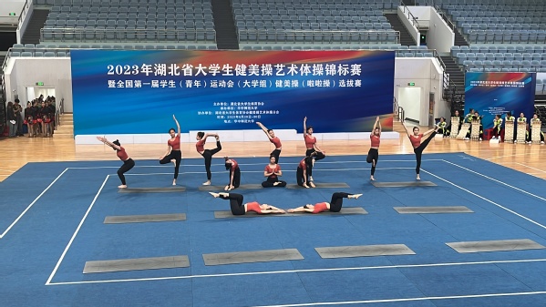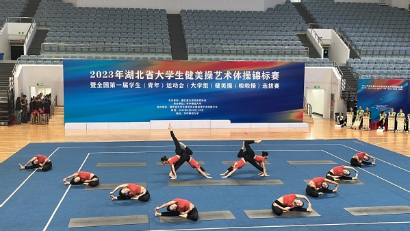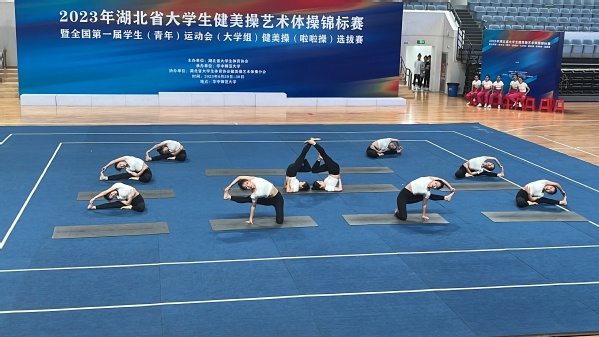 武汉职业技术学院的瑜伽一队、瑜伽二队两组参加了比赛。在现场,她们伴随着舒缓悠扬的音乐,在赛场上自信从容地将动作做到极致,通过队友之间的默契配合充分展现的我校瑜伽队的风采,与中国地质大学、中南民族大学等本科高校的同场竞技,毫不逊色。