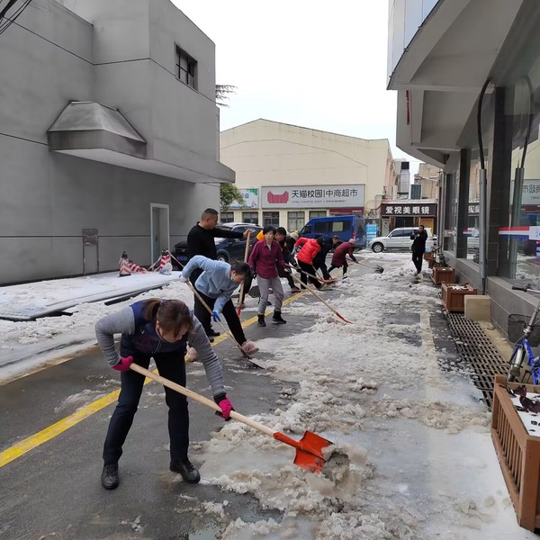 体美部8名党员老师,在寒潮中逆行。对大型机械无法清理到的学校东区体育馆附近、学校地下通道出入口、学校门口、西区6-10栋楼下道路进行扫雪除冰、清除路障,为师生筑起一道安全屏障,打通平安出行路。