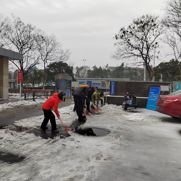 体美部8名党员老师,在寒潮中逆行。对大型机械无法清理到的学校东区体育馆附近、学校地下通道出入口、学校门口、西区6-10栋楼下道路进行扫雪除冰、清除路障,为师生筑起一道安全屏障,打通平安出行路。