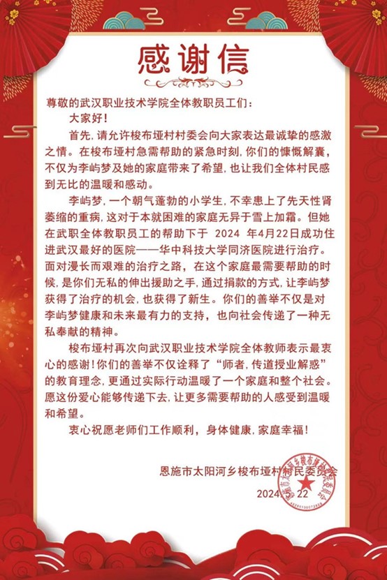近日,学校收到了恩施市太阳河乡梭布垭村村委会发来的感谢信,信中对我校教职工们慷慨解囊,资助患病儿童的行为表达了最诚挚的敬意和感激。爱心捐助李屿梦同病魔抗争的善举,彰显了武职教职工们的大爱情怀和扶危济困的美德,也体现了武汉职业技术学院在社会公益事业中扮演的重要角色。正如感谢信最后所言:“你们的善举不仅诠释了‘师者,传道授业解惑’的教育理念,更通过实际行动温暖了一个家庭和整个社会。”在这个充满爱的世界里,每一份善意都将传递正能量,为身处困境、需要帮助的人带来战胜苦难的信心和勇毅前行的希望。