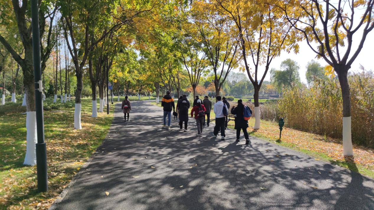 随后,队伍转战至东湖绿道,漫步在武汉的生态与文化长廊。秋季的磨山三面临水,逶迤六峰,湖光山色交相辉映,倒映着蓝天白云和周围的山色,仿佛是大自然精心绘制的一幅色彩斑斓的画卷,教职工们纷纷驻足观赏,拍照留念,享受着大自然带来的视觉盛宴。