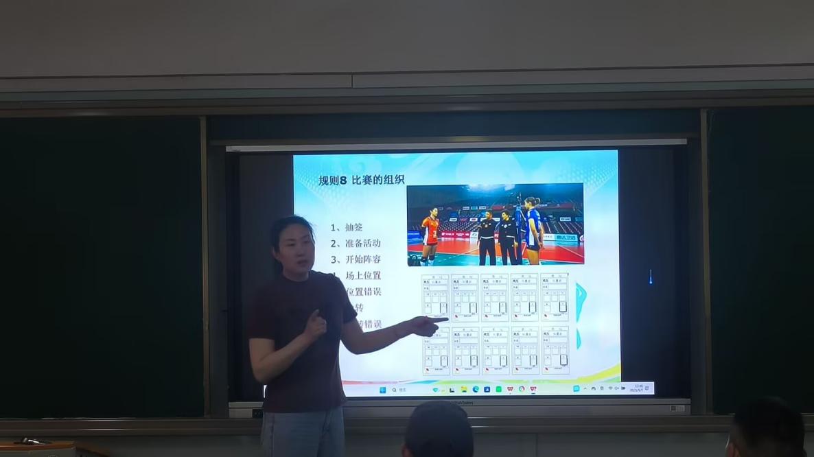 国家级裁判、体育美育工作部党总支书记、主任闫升副教授担任主讲。培训采用“理论 +案例 +实操” 相结合的方式,深入浅出地为参训成员讲解了气排球竞赛规则、裁判法、常见犯规判罚等内容。闫教授首先从气排球比赛的基本规则讲起,详细阐述了气排球比赛的场地规格、比赛流程、计分方法、球员站位规则等内容,让参训成员对气排球裁判工作有了初步认识,着重强调了容易被忽视的细节和关键判罚要点。