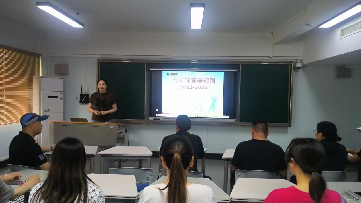 国家级裁判、体育美育工作部党总支书记、主任闫升副教授担任主讲。培训采用“理论 +案例 +实操” 相结合的方式,深入浅出地为参训成员讲解了气排球竞赛规则、裁判法、常见犯规判罚等内容。闫教授首先从气排球比赛的基本规则讲起,详细阐述了气排球比赛的场地规格、比赛流程、计分方法、球员站位规则等内容,让参训成员对气排球裁判工作有了初步认识,着重强调了容易被忽视的细节和关键判罚要点。