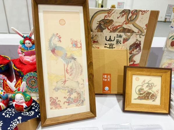 我校此次参展的作品为康峰老师创作的“瑞兽・花草宣纸微喷装饰画与同名冰箱贴”。该作品深度融合中华优秀传统文化元素与现代美学设计理念,以细腻的笔触、雅致的色彩呈现瑞兽的灵动与花草的生机,既展现了我校美育教师扎实的艺术功底与创新思维,更传递出对中华优秀传统文化的深刻理解与当代诠释。参展作品陈列于北京馆“国家级文创试验区”展位,开展以来,展位前始终人气旺盛,成为展会热门打卡点,不少观众对作品的艺术价值、创意理念给予高度评价,纷纷询问作品创作灵感与文化内涵。