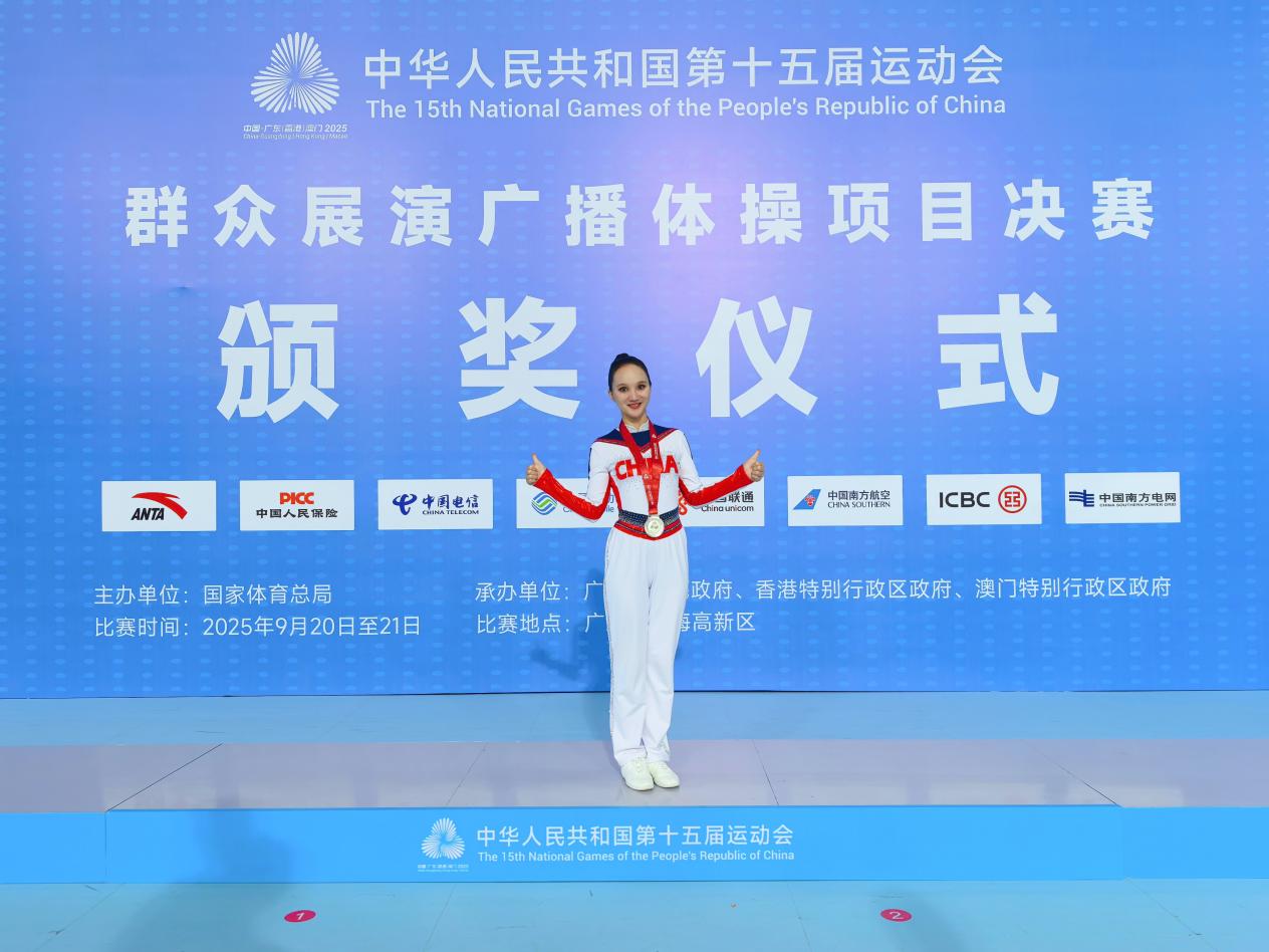 中华人民共和国第十五届运动会群众展演广播体操项目决赛2025年9月20-21日在广东珠海隆重举行。我校教师付勤代表湖北省广播体操队出战,经过精彩激烈的角逐以第二名的成绩获得了二等奖,为湖北和中国体育争得了荣誉!