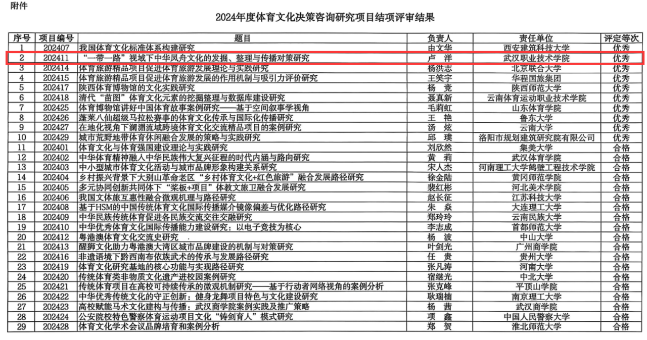11月27日,国家体育总局体育文化发展中心公布了2024年度体育文化决策咨询研究项目结项情况。武汉职业技术大学体育美育工作部卢洋老师团队承担的项目《“一带一路”视域下中华凤舟文化的发掘、整理与传播对策研究》在29项参评项目中表现突出,荣获优秀等级排名前列,得到评审专家高度评价。